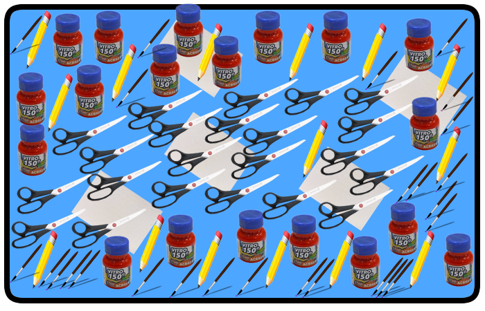 Parece que o artista deixou seus objetos espalhados pelo ateliê: lápis, vidro de tinta, tesoura, papel e pincel.