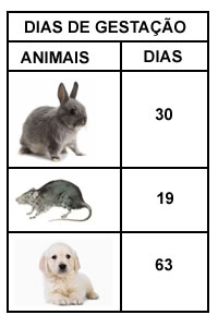 Observe a tabela. Click na alternativa que indica o número de dias da gestação do coelho.