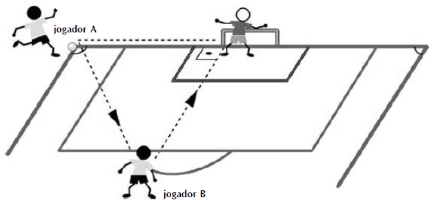 18. Suponha que durante o treinamento de uma seleção de futebol, o técnico treinou uma nova jogada: o jogador A leva a bola para a marca do escanteio e toca para o jogador B que chuta a bola em cima da trave, como representado abaixo.